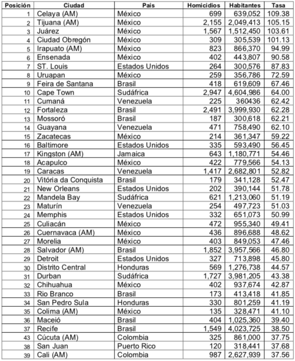 En los primeros diez lugares lidera Celaya, seguido de Tijuana, Juárez, Ciudad Obregón, Irapuato, Ensenada, la ciudad norteamericana de ST, Loui; Uruapan, Feria de Santana, Brasil; y Cape Town, Sudáfrica.