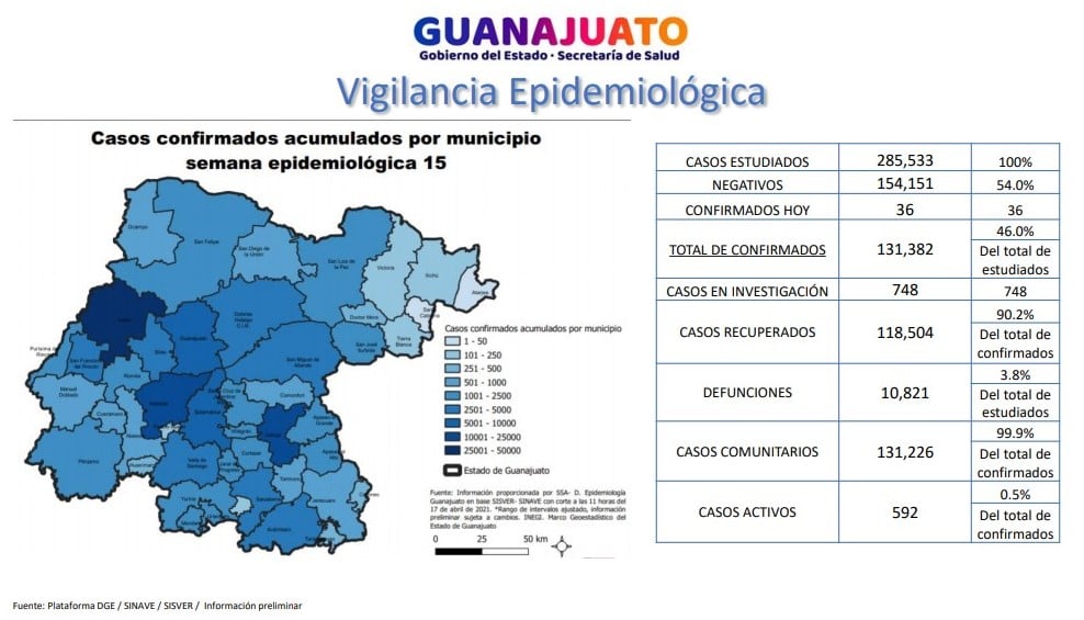 En Guanajuato se han estudiado 285 mil 533 casos, de los cuales el 54% han resultado negativos; el 46% confirmados.