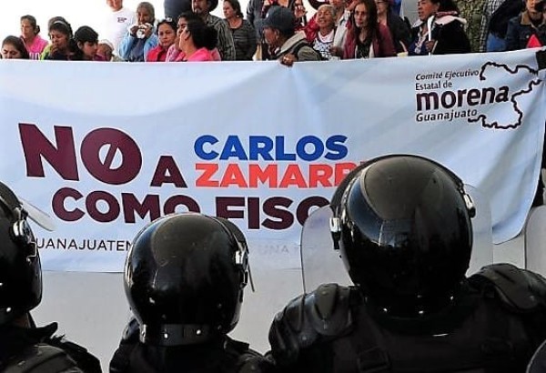 De acuerdo a los reportes periodísticos, el grupo de manifestantes estaban liderados por la entonces dirigente de Morena, Alma Alcaraz Hernández, denunciante ante la PDHEG. A este grupo de manifestantes se le impidió el ingreso a la explanada del recinto para proseguir con su manifestación.