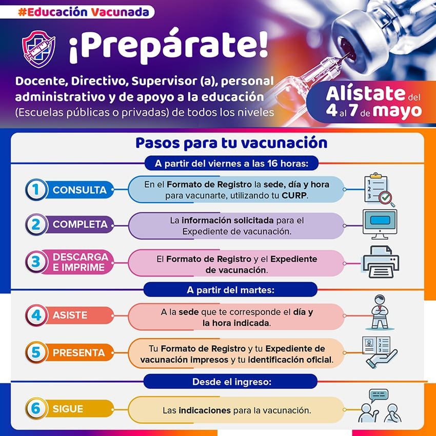 De acuerdo a las primeras indicaciones difundidas, con su CURP, los docentes y personal de apoyo deberán consultar en el formato de registro, la sede, día y hora para vacunarse, completar la información para la integración del expediente, posteriormente descargar e imprimir el formato.