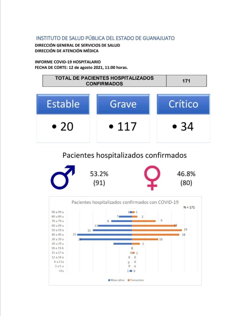 Hasta el corte de las 11 de la mañana de este jueves se reportó la hospitalización de 171 guanajuatenses, ocho más a los registrados un día anterior; 571 nuevos casos, ocho defunciones, 1 mil 131 casos en investigación y 3 mil 645 casos activos.