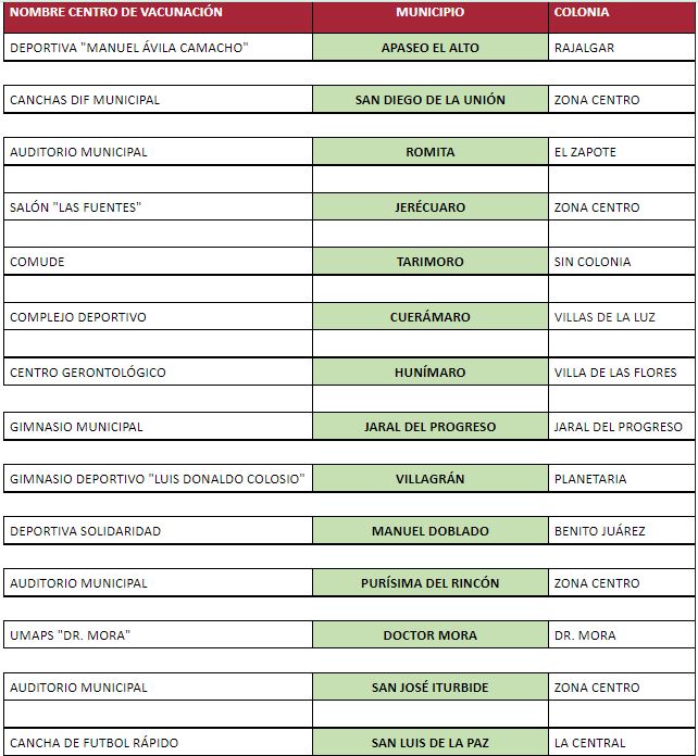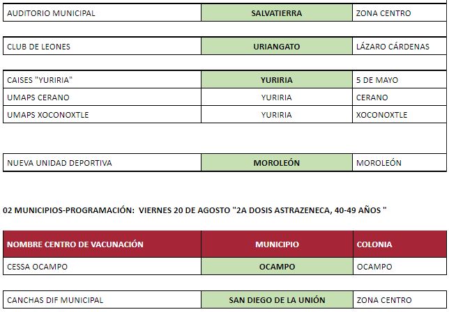 En Ocampo y San Diego de la Unión las vacunas aplicarán a personas de 40 a 49 años.Otras vacunas serán para segunda dosis de personas de 50 a 59 años en los municipios de Apaseo el Alto, Cortazar, Cuerámaro, Doctor Mora, Huanímaro, Jaral del Progreso, Jerécuaro, Manuel Doblado, Purísima del Rincón, Romita, San José Iturbide, San Diego de la Unión, San Luis de la Paz, Salvatierra, Tarimoro, Uriangato, Villagrán, Yuriria y Moroleón.