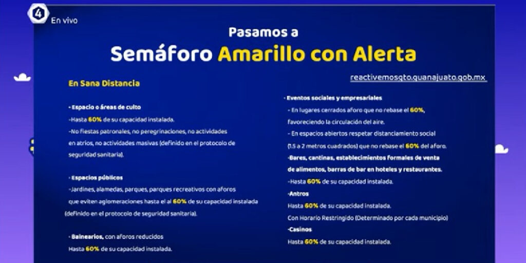 Después de cinco meses, la Secretaria de Salud de Guanajuato anunció que la entidad regresará al semáforo amarillo con alerta, aunque aclaró que esto no significa se vaya a detener el regreso a clases programado para el próximo 30 de agosto.