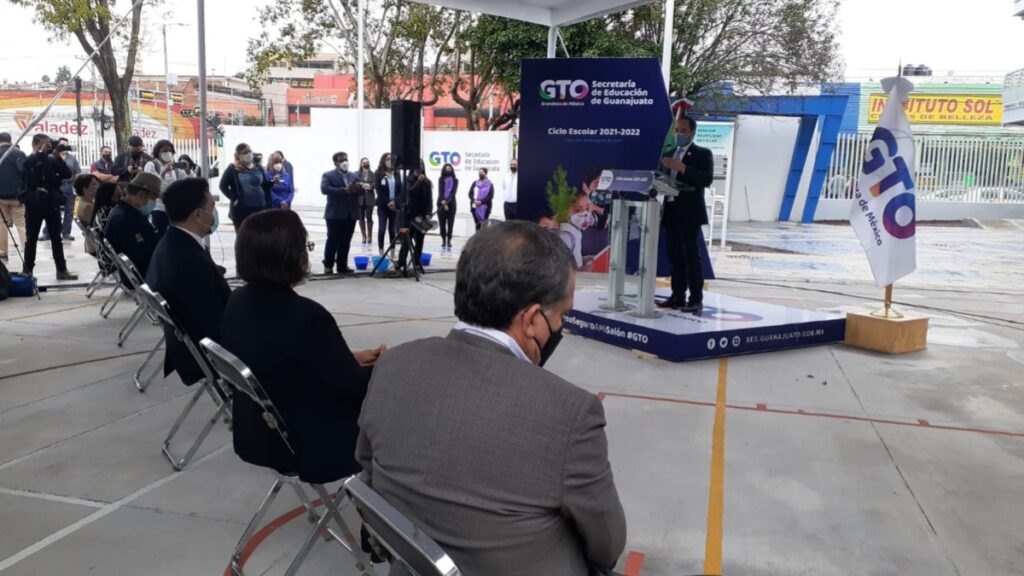 En el patio de la escuela hay una carpa, un pódium y varias sillas de metal. La escuela primaria Eufrasia Pantoja fue el plantel en donde se llevó a cabo el evento oficial del arranque del ciclo 2021-2022, encabezado por la Secretaría de Educación de Guanajuato (SEG).