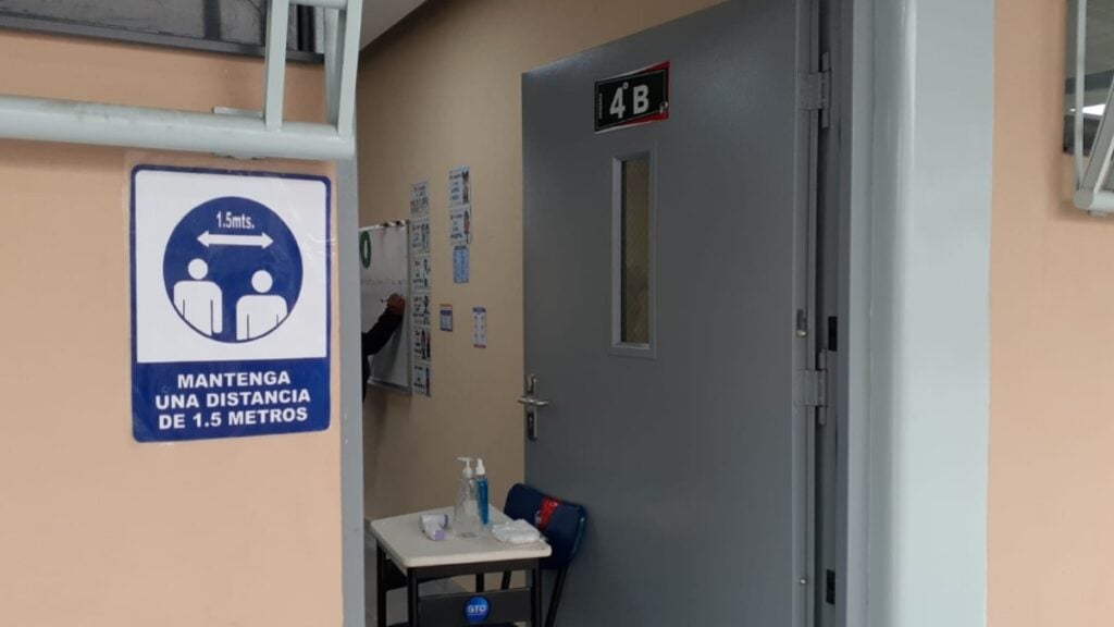 En la entrada de su aula hay dos flechas que indican por dónde deben pasar los que entran y por dónde los que salen. Adentro el profesor le aplica más alcohol en gel y le asigna su asiento. Ese y otros salones tienen a lo mucho a 15 estudiantes con sana distancia.