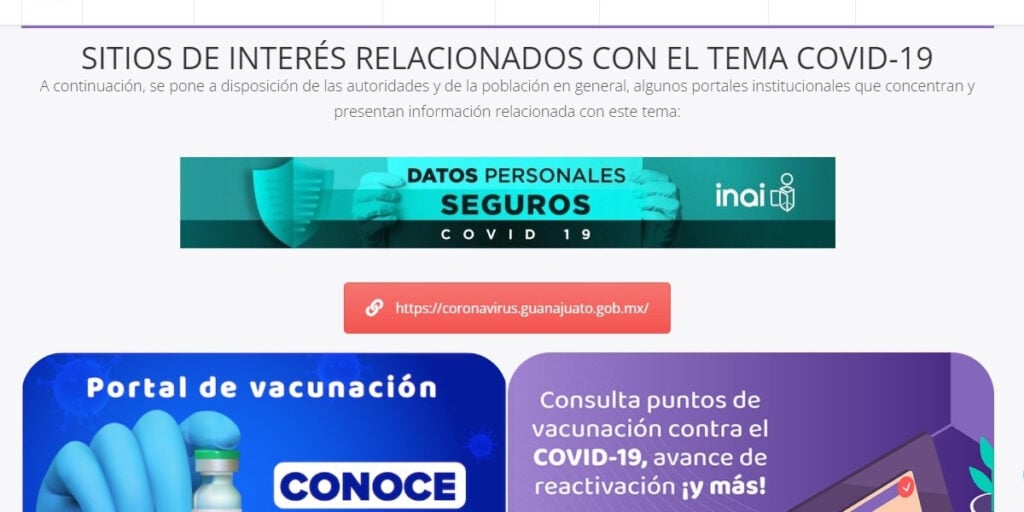 Además, la información del micrositio está disponible en un formato accesible para su navegación, procurando la vinculación con información en materia de control de la enfermedad, vacunación y documentos informativos, tanto normativos como recomendaciones prácticas para la protección de su información personal durante y con motivo de la contingencia COVID-19.