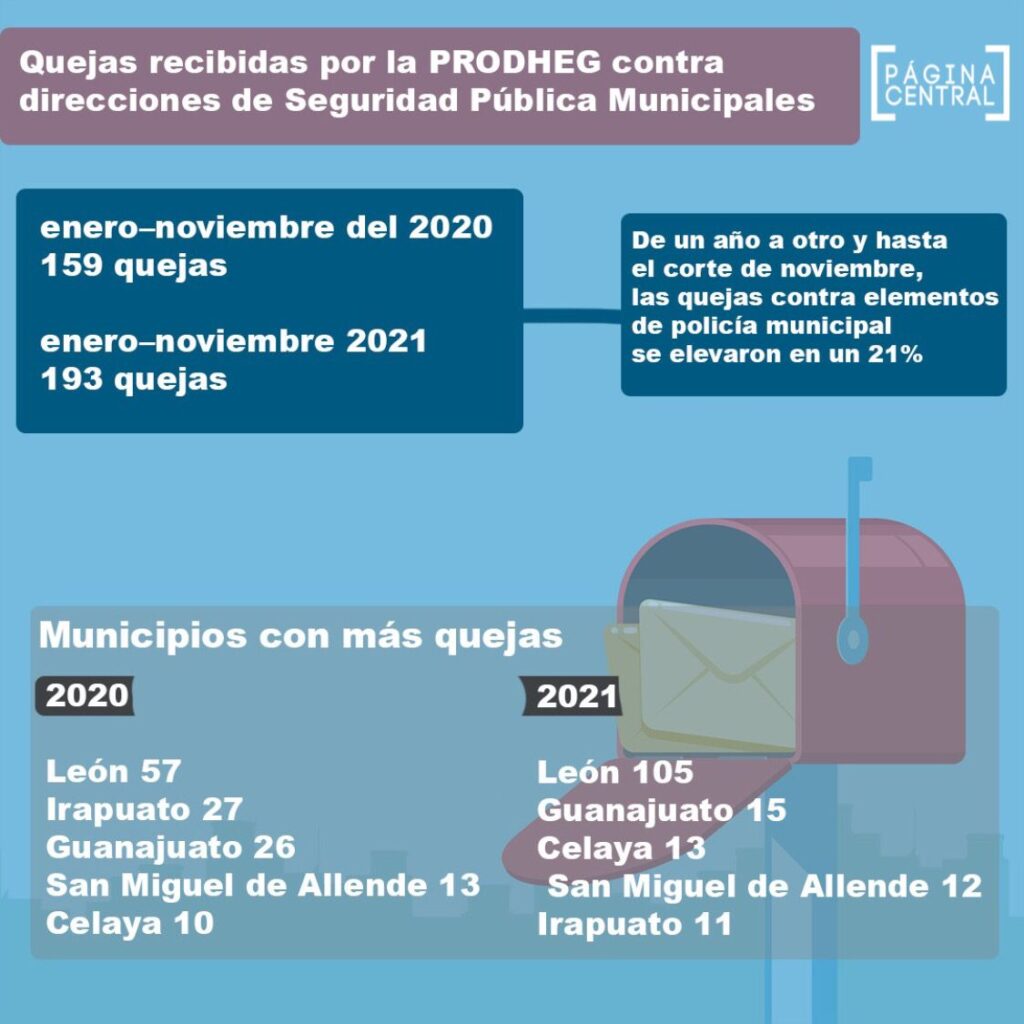 Celaya es otra de las ciudades que a once meses de este 2021 refiere un incremento en las denuncias contra elementos de seguridad municipal, con 13 quejas; mientras que al cierre del 2020 reportó 10 denuncias.En tanto, Irapuato, Guanajuato y San Miguel de Allende, otras ciudades con mayor número de expedientes de queja abiertos por la Prodheg, reportan cifras por debajo de las registradas en el 2020.El año pasado la Policía Municipal de Irapuato registró 27 quejas; Guanajuato 26 y San Miguel de Allende 13; mientras que hasta el corte de noviembre de este 2021 la corporación de seguridad de Irapuato acumuló 11 denuncias, Guanajuato 15 y San Miguel de Allende 12.San Miguel de allende está a solo una denuncia de igualar las cifras del año pasado.