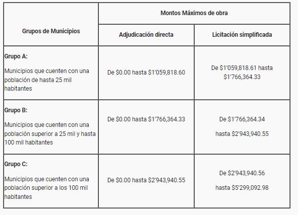 Los montos fueron divididos en tres bloques uno para ciudades con menos de 25 mil habitantes, en donde el monto máximo para adjudicar sin licitación es de un millón 59 mil 818 pesos.El bloque b está conformado por las localidades más de 25 mil habitantes, en donde los contratos podrán ser adjudicados directamente cuando sean menores a un millón 766 mil 364.