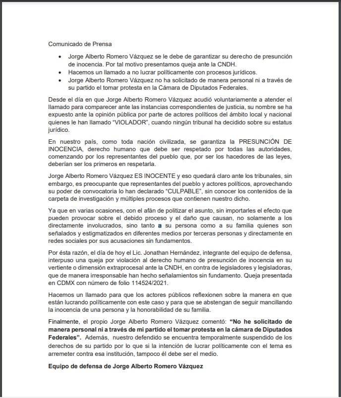 Horas más tardes, abogados representantes del político panista acusado de abuso sexual, emitieron un comunicado en el que expresaban su rechazo al uso político de su caso. Además, de decirse inocente.