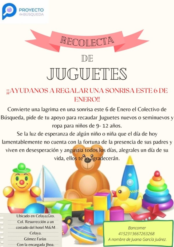 “Convierte una lágrima en una sonrisa este 6 de enero, el Colectivo de Búsqueda pide de tu apoyo para recaudar juguetes nuevos y seminuevos, y ropa para niñas y niños de 9 a 12 años”, piden a través de la convocatoria de ayuda a los Reyes Magos.