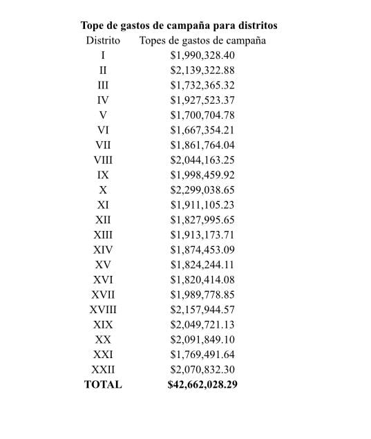 En tanto las campañas para diputaciones locales en Guanajuato tendrán un tope de 42 millones 662 mil 28 pesos, entre los 22 distritos electorales de los que se compone la entidad.