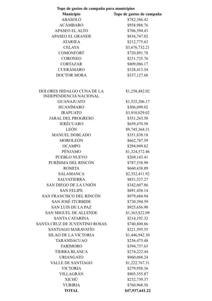 Los municipios con el tope de ejercicio más alto son León con 9 millones 745 mil 364 pesos, Irapuato con 3 millones 910 mil 29 pesos, Celaya con 3 millones 676 mil 732 pesos, Salamanca con 2 millones 352 mil 411 pesos y Silao con un millón 446 mil 942 pesos para los topes de gastos de campaña por candidatos.