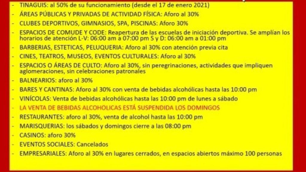 Dentro de las limitaciones que persistirán al menos esta semana es la prohibición de venta de bebidas alcohólicas los domingos, la operatividad del 50% en tianguis; áreas públicas y privadas, cines, teatros, museos, eventos culturales, piscinas, clubes deportivos, gimnasios, bares y cantinas con aforos del 30%.