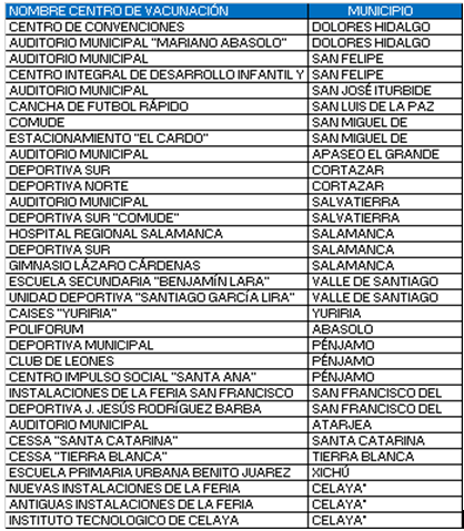 Por lo que a partir del lunes se iniciará la vacunación en primera dosis para las personas de 40 a 49 años en: Abasolo, Apaseo el Grande, Cortazar, Dolores Hidalgo, Pénjamo, Salamanca, Salvatierra, San Felipe, San Francisco del Rincón, San José Iturbide, San Luis de la Paz, San Miguel de Allende, Valle de Santiago, Yuriria, Atarjea, Santa Catarina, Tierra Blanca, Xichú.