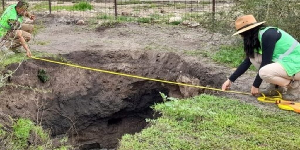 La dependencia señaló que además, a unos 50 metros de distancia, se localizó un hundimiento con un diámetro aproximado de 70 por 60 centímetros y una altura de 83 centímetros.