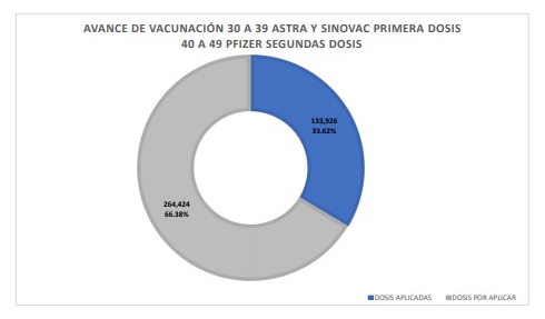 En tanto, en el primer día de aplicación de vacunas para personas de 30 a 39 años, del laboratorio AstraZeneca y Sinovac, fueron aplicadas 98 mil 301 dosis.