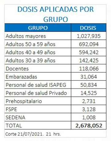 Hasta el corte de este miércoles se han aplicado dos millones 678 mil 52 dosis de vacunas anticovid-19 en fase de primera y segunda dosis, así como dosis única de la vacuna CanSino.