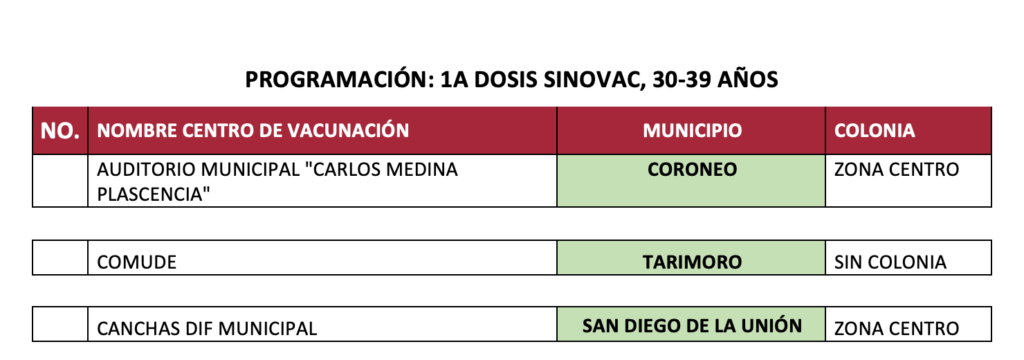 A partir de mañana martes se espera que comience la vacunación contra la COVID-19 en las personas de 30 a 39 años de los municipios de San Diego de la Unión, Tarimoro y Coroneo.