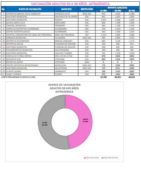 Así también reportaron el avance de vacunación de adultos entre 50 y 59 años, quienes también recibieron el biológico AstraZeneca y que corresponde a Apaseo el Alto, San Diego de la Unión, Romita, Jerécuaro, Tarimoro, Cuerámaro, Huanímaro, Jaral del Progreso, Villagrán, Manuel doblado, Purísima del Rincón, Doctor Mora, San José Iturbide, San Luis de la Paz, Cortazar, Moroleón, Salvatierra, Uriangato y Yuriria.