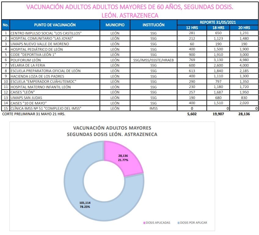 Guanajuato logró vacunar a 28 mil 136 personas de la tercera edad, quienes ya recibieron su segunda dosis de vacuna anticovid-19 del laboratorio AstraZeneca.