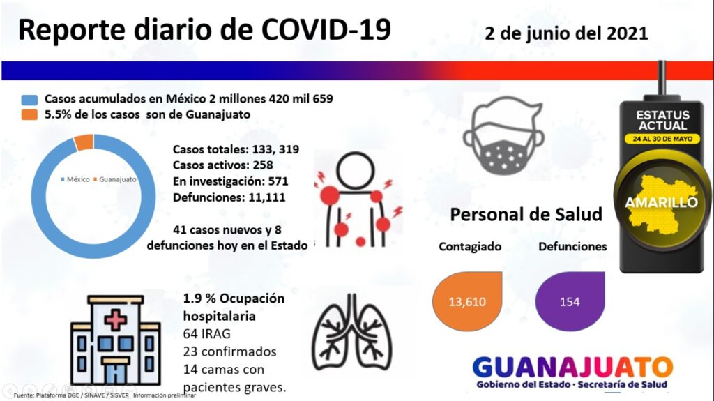 En el panorama nacional hay 2 millones 420 mil 659 personas que se han contagiado del virus del SARS-CoV-2, con lo que Guanajuato representa el 5.5 % de los casos acumulados a nivel nacional.