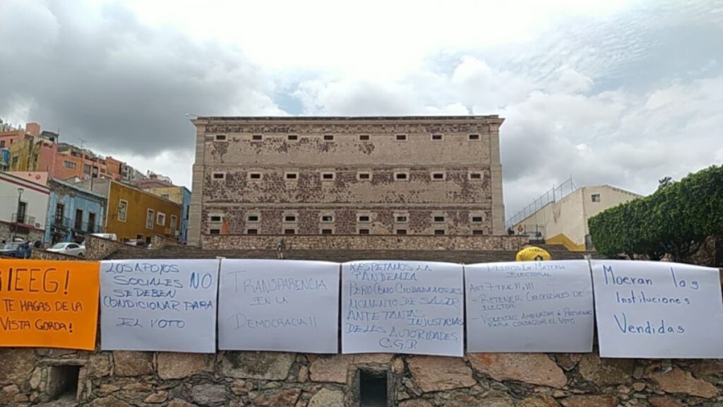 Con cartulinas en mano llegó el grupo de ciudadanos a las instalaciones del IEEG, quienes reconocieron tenían la intención de aventar jitomates, pero decidieron de último momento no hacerlo. Acusan de condicionar la entrega de apoyos sociales.
