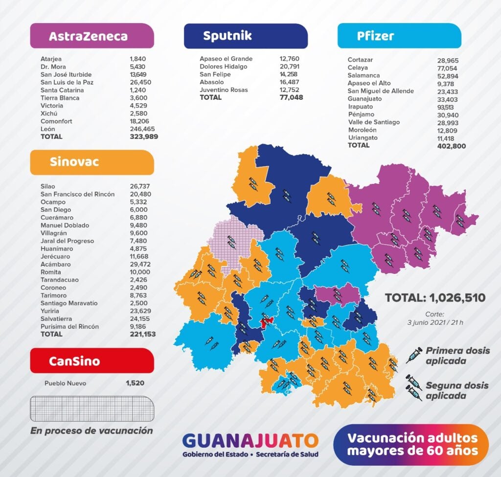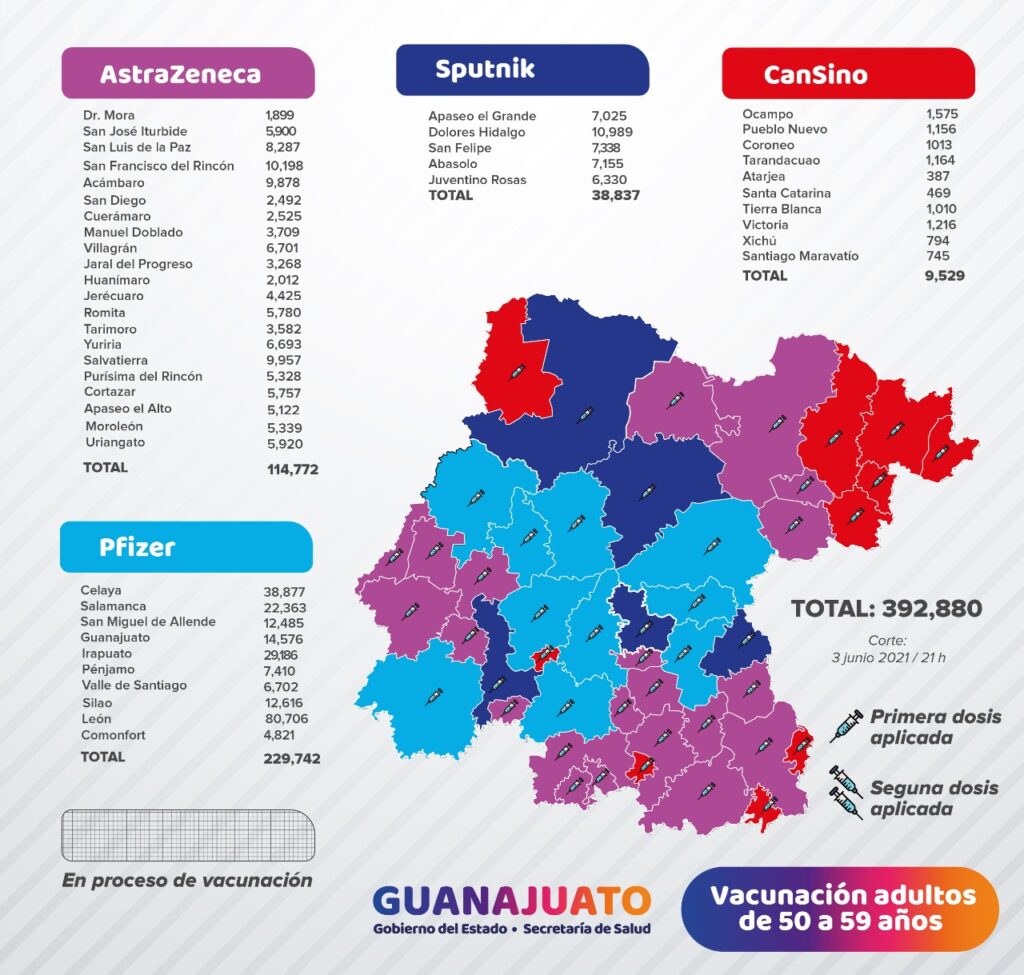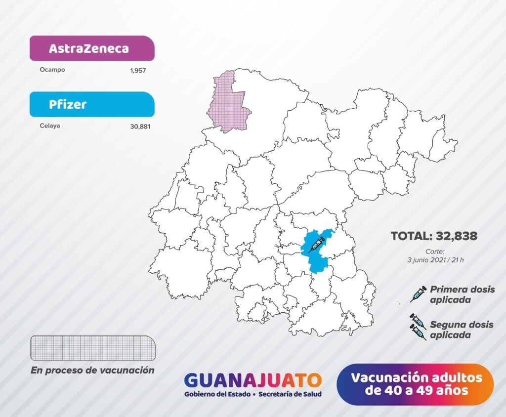 Mientras que en las ciudades de Acámbaro, Cortazar, Dolores Hidalgo, Guanajuato, Jerécuaro, Ocampo, San Felipe, San Luis de la Paz, San Miguel de Allende, Tarandacuao y Yuriria, se reportó un caso.