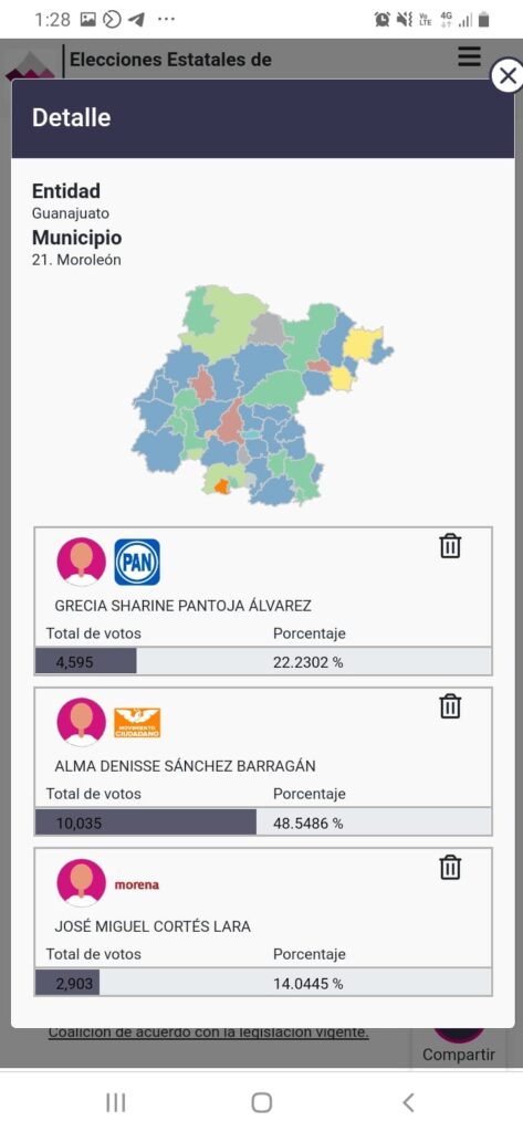 De acuerdo con el Programa de Resultados Preliminares, Alma Denisse Sánchez Barragán se ha convertido en virtual ganadora de la Presidencia Municipal de Moroleón por el Movimiento Ciudadano.