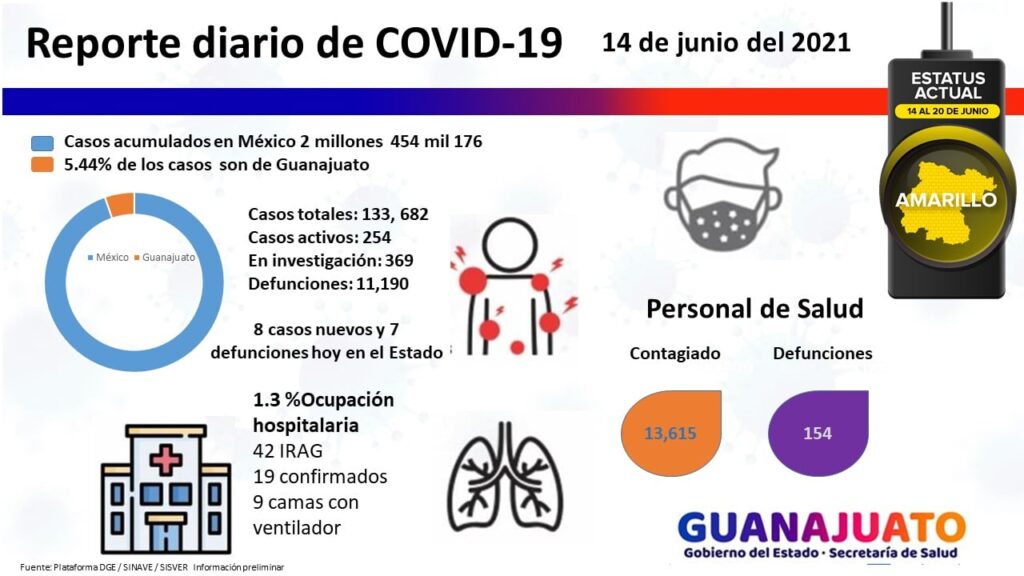 De los municipios del corredor industrial, Silao de la Victoria reporta un deceso mientras que Irapuato completa la lista con dos fallecimientos por COVID-19.Los casos activos al momento son 254, casos en investigación 369, en los últimos días la dependencia de Salud reporta la hospitalización de 11 varones y 8 mujeres, de los cuales 15 están graves y 4 en estado crítico.
