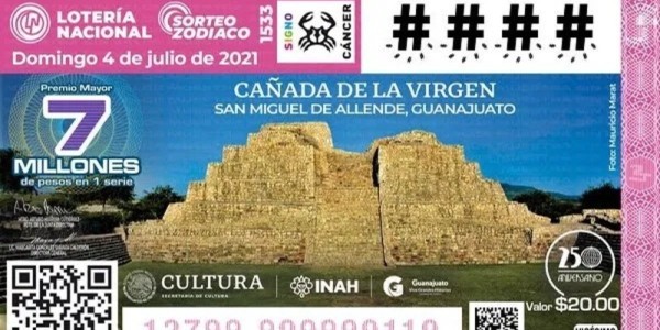 La develación fue realizada por autoridades de la Lotería Nacional, la Secretaría de Cultura del Gobierno de México, a través del Instituto Nacional de Antropología e Historia (INAH); la Coordinación de Memoria Histórica y Cultural de México, la Secretaría de Turismo de estado de Guanajuato y la Asociación de secretarios de Turismo (Asetur).Juan José Álvarez Brunel, secretario de Turismo de Guanajuato, resaltó el liderazgo del gobernador Diego Sinhue Rodríguez Vallejo en el desarrollo de la Zona Arqueológica Cañada de la Virgen, y a nombre del sector turístico de Guanajuato agradeció a la Lotería Nacional por haber incluido este asentamiento prehispánico en el sorteo.“Guanajuato es un estado con una gran diversidad de atractivos turísticos y, por ello, es que la estrategia de la Sectur manifiesta un impulso a la actividad cultural, la cual provoca y renueva la intención de que los visitantes y turistas vengan a la entidad a vivir grandes historias”, dijo Álvarez Brunel.Margarita González Saravia Calderón, directora general de Lotería Nacional, mencionó que los billetes de las zonas arqueológicas resaltan los valores culturales que guarda cada rincón del país, además de apoyar la reactivación del turismo; “son zonas protegidas por el INAH y motivo de orgullo nacional”.Informó que el Sorteo Zodiaco No. 1533 cuenta con un Premio Mayor de 7 millones de pesos en una serie y una bolsa repartible de 24 millones de pesos en premios; se realizará el domingo 4 de julio, en punto de las 20:00 horas, en el salón de sorteos de la institución, ubicado en el Edificio ‘El Moro’.En su intervención el director del Centro INAH Guanajuato, David Jiménez Guillén, afirmó que para el INAH, a través de esta representación estatal, es un honor atestiguar la presentación del billete de Lotería alusivo a la Zona Arqueológica Cañada de la Virgen, en la cual hace 50 años, como parte de la descentralización de la institución, se iniciaron trabajos de arqueología, “de manera que Guanajuato fue el primer estado a nivel nacional, donde inició este proceso.“La emisión de este billete es un reconocimiento al sitio, pero también a los actores que lo erigieron para asentarse en la cuenca central del Río Laja, a los indígenas que la fundaron y a los que la reocuparon, así como a quienes lo rescataron, investigaron y han puesto al servicio de todos nosotros, para reencontrarnos con una parte de nuestro pasado histórico”, expresó.A su vez, el coordinador de la zona arqueológica, Omar Cruces Cervantes, explicó que Cañada de la Virgen es un centro ceremonial importante, un lugar de culto y peregrinación ubicado en el área de frontera septentrional mesoamericana, el cual se desarrolló entre los años 540 y 1050 d.C., y formó parte de la tradición arqueológica del Río Laja, al oriente y centro de Guanajuato.El billete del Sorteo Zodiaco No. 1530 ya está disponible para su adquisición en los 12 mil puntos de venta en el territorio nacional y a través de las páginas oficiales, donde se pueden adquirir los cachitos electrónicos, ya que salieron a la venta dos millones 400 mil billetes. El costo de la fracción o cachito es de 20 pesos, mientras que el costo de la serie o entero es de 400 pesos.MEJZ*