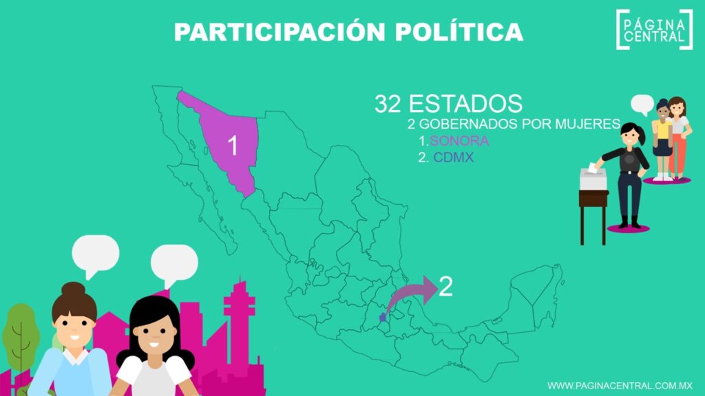 De los 32 estados del país únicamente dos son gobernados por mujeres: Sonora, Claudida Pavlovich; y en la Ciudad de México, Claudia Sheimbaum.