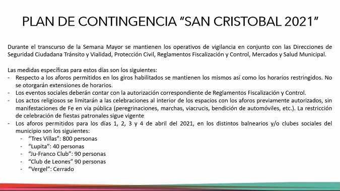 De igual forma, los aforos en los balnearios y clubes sociales continúan vigentes, por tal razón del 1 al 4 de abril, habrá operativos de revisión en los mismos.