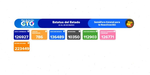 Para reactivarnos, hay que cuidarnos.En GTO ¡Sí nos cuidamos!Evita aglomeraciones, mantén sana distancia;usa alcohol en gel y cubrebocas #UnidosSomosGrandeza pic.twitter.com/206ffSSjvD— Secretaría de Salud (@SaludGuanajuato) March 22, 2021