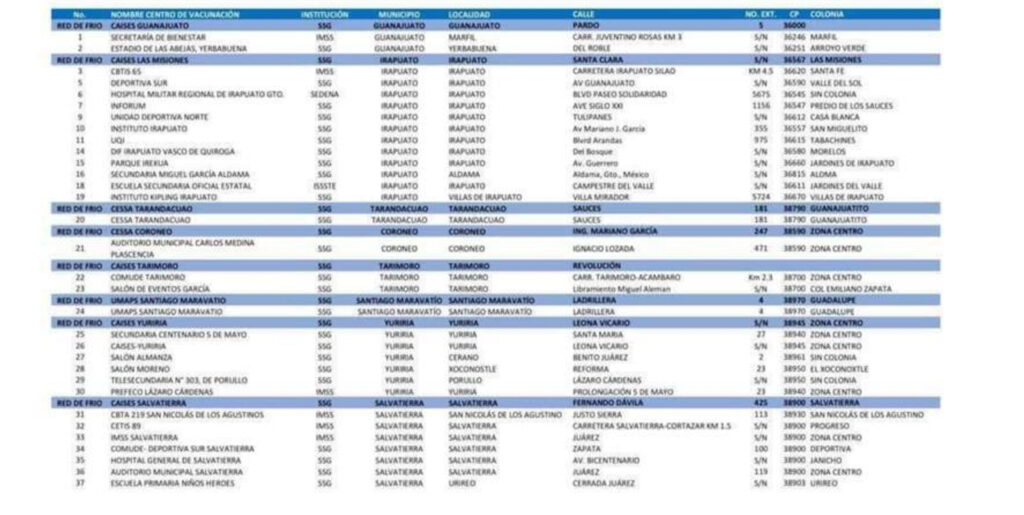 Las ciudades en las que se distribuirán las vacunas son Guanajuato, Irapuato, Santiago Maravatío, Tarandacuao, Tarimoro, Salvatierra, Coroneo y Yuriria, se le informó en una reunión extraordinaria a las autoridades de salud del estado.