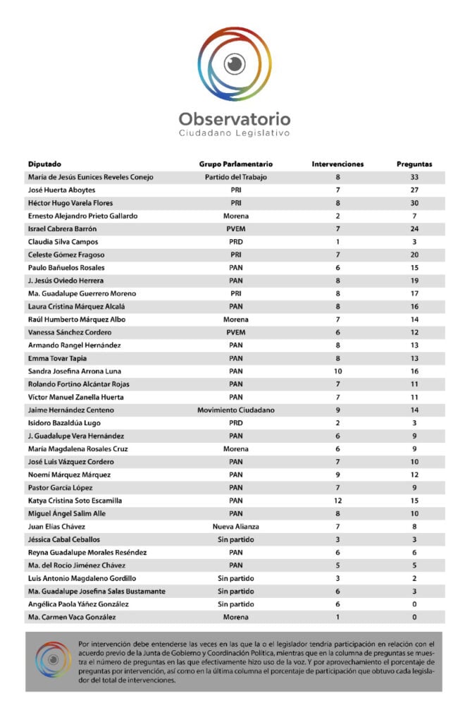 La diputada del PT, María Reveles Cornejo, realizó 33 preguntas y registró 8 intervenciones; seguido del diputado de PRI, Hugo Varela Flores que sumo 30 preguntas en 8 intervenciones; y en tercer lugar el también priísta, José Huerta Aboytes, en siete intervenciones.