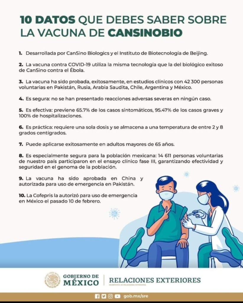 Los ensayos de CansinoBio resultaron con éxito en 42 mil 300 voluntarios en Rusia, Arabia Saudita, Pakistán, México, Chile y Argentina.