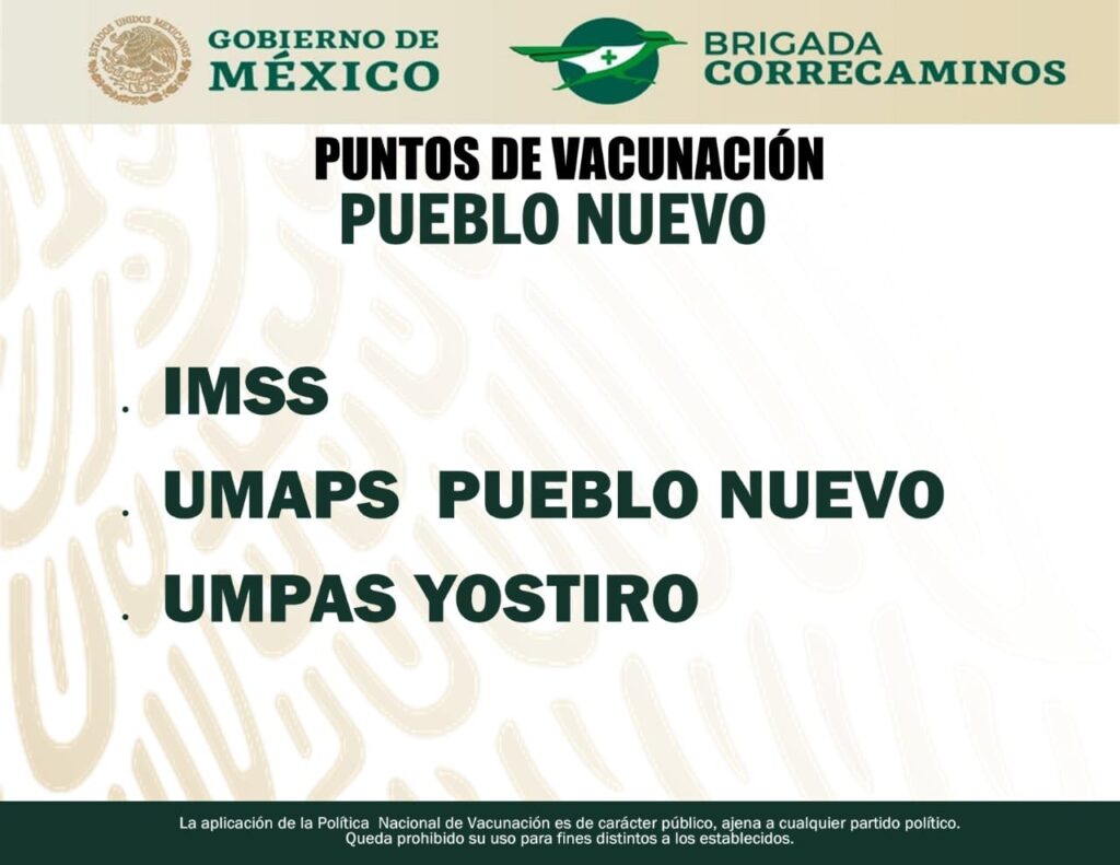 Las vacunas se aplicarán en el IMSS de la Zona Centro de Pueblo Nuevo, en Yóstiro de San Antonio y en Lázaro Cárdenas, que son unidades médicas de la Secretaría de Salud.