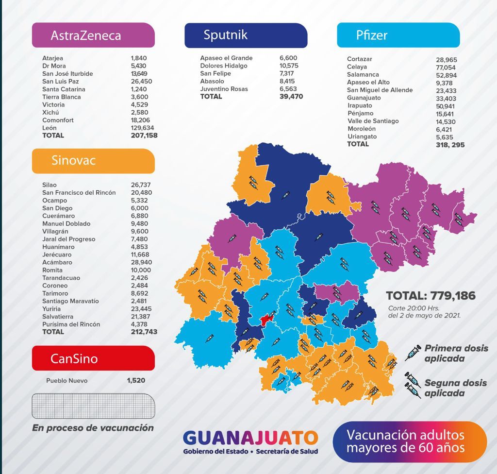Para los municipios de Apaseo el Grande, Dolores Hidalgo, San Felipe, Abasolo y Juventino Rosas, el gobierno federal envió 39 mil 710 dosis del biológico ruso Sputnik V, con ello, los adultos mayores de 60 años podrán completar su esquema de vacunación.