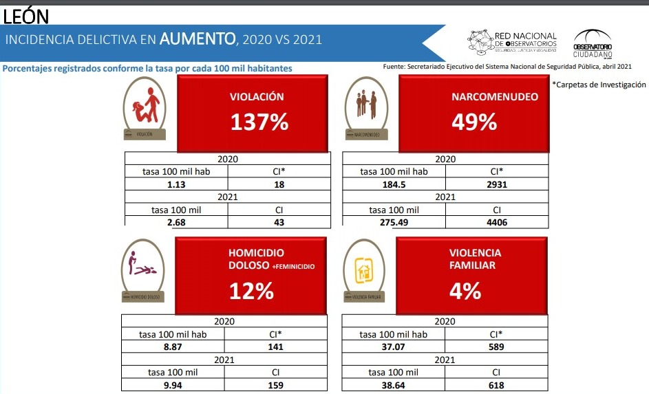 En León creció la violación, narcomenudeo, homicidio doloso y violencia familiar