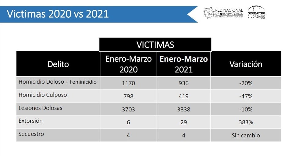 En tanto, el homicidio doloso se redujo un 12%, de 854 reportadas en 2020 frente a 752 para este año.
