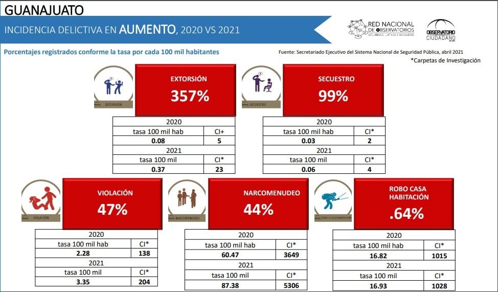 La extorsión, secuestro, violación y narcomenudeo fueron los delitos que registraron un incremento durante el primer trimestre de este año frente al mismo periodo de 2020.