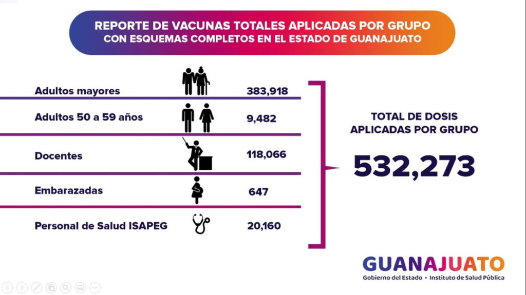 A la fecha hay 532 mil 273 guanajuatenses vacunados con un cuadro completo, de los cuales 383 mil 918 son personas adultas mayores, 9 mil 482 adultos de entre 50 y 59 años de edad, 118 mil 066 docentes, 647 embarazadas y 20 mil 160 personal de salud (ISAPEG).