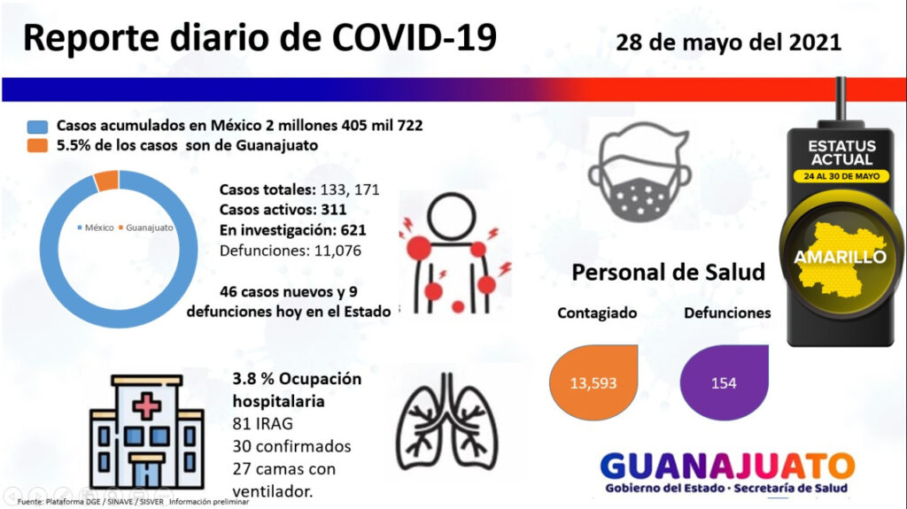 Asimismo, se reportaron nueve decesos de guanajuatenses y 46 nuevos contagios por coronavirus, para una suma total de 133 mil 171 contagios y 11 mil 076 fallecimientos.