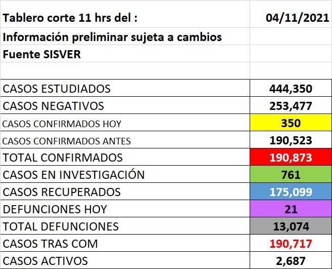 Hay también 13 mil 74 defunciones con las 21 muertes reportadas este jueves de las cuales dos ocurrieron en octubre pasado y 19 entre el 1 y el 4 de noviembre.