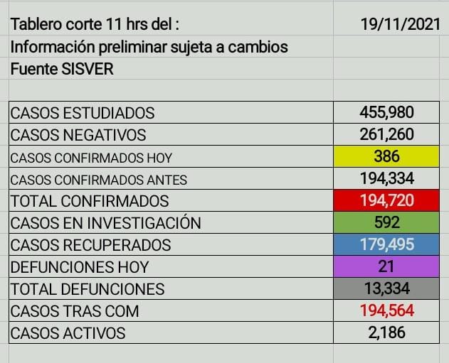 También se han estudiado a 454 mil 907 personas de las que 260 mil 513 han resultado negativo; en este momento hay 760 casos en investigación y 2 mil 021 casos activos.