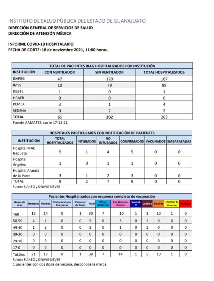 Al corte el Instituto de Salud Pública de Salud Pública del Estado de Guanajuato reporta 263 hospitalizados con Infección Respiratoria Aguda Grave, de los cuales 139 están confirmados positivos a SarsCov2.
