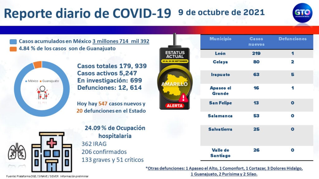 Para este sábado en Guanajuato se reportó por parte de la SSG, un total de 362 personas hospitalizadas con Infección Respiratoria Aguda Grave de los que 206 están confirmados con COVID-19; 133 están graves y 51 están en estado crítico.