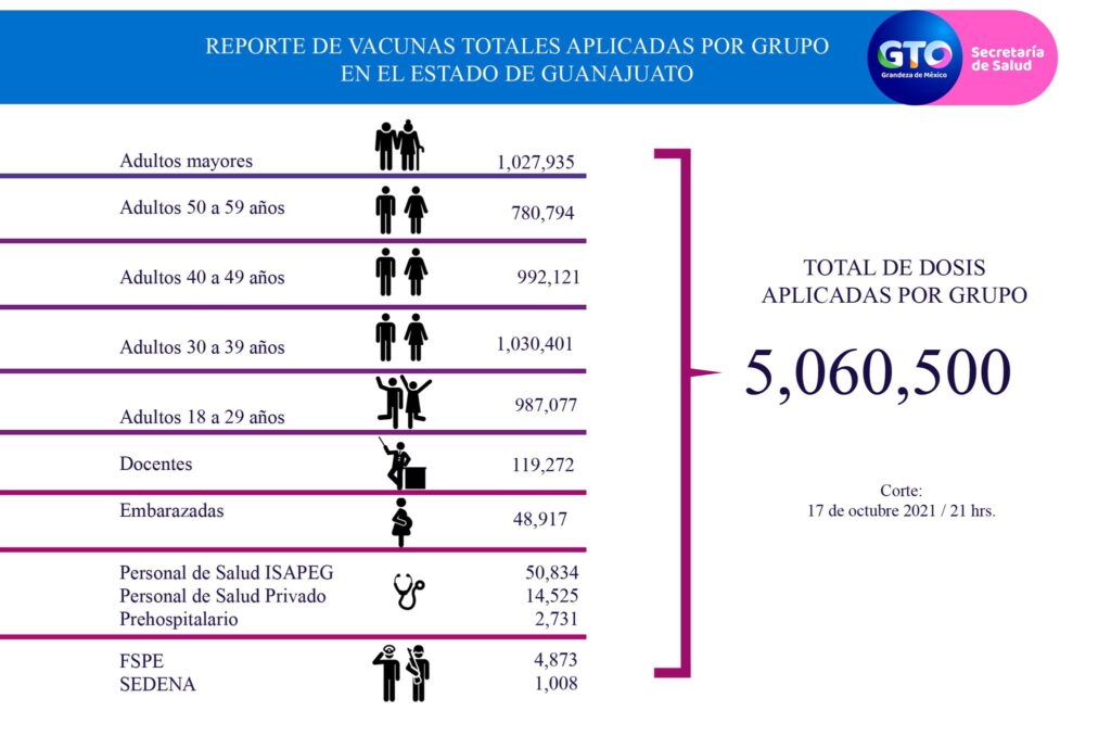 En total, se han aplicado en el estado de Guanajuato 5 millones 60 mil 500 vacunas contra el COVID-19.