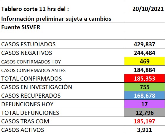 Con la 17 muertes de hoy la entidad acumuló 12 mil 796 muertes por coronavirus.