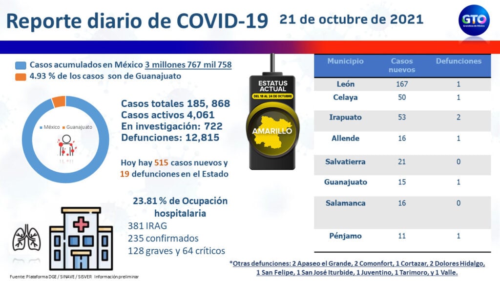 De acuerdo al reporte de la Secretaría de Salud de Guanajuato (SSG), la cifra del lunes 18 de octubre sumó 211 hospitalizaciones y 54 personas intubadas y en estado crítico de salud.Para este jueves la cifra ya alcanzó los 235 guanajuatenses hospitalizados y 65 personas que se debaten entre la vida y la muerte.